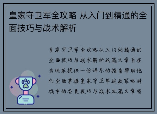 皇家守卫军全攻略 从入门到精通的全面技巧与战术解析